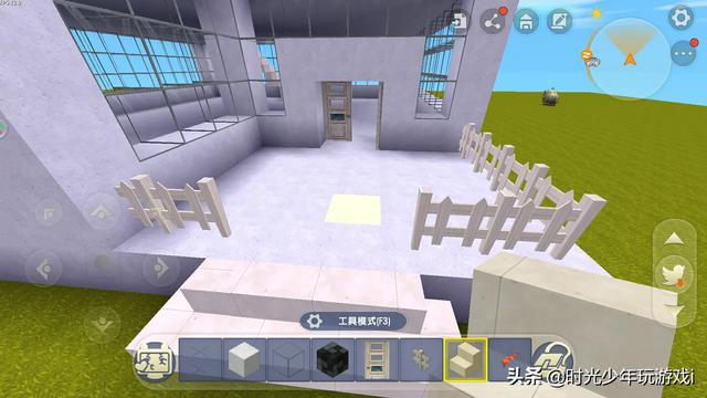 材料:方块(我选白色硬砂块),玻璃片和块(颜色任意)楼梯(我选瓦石楼梯)门(任意)栅栏(任意)