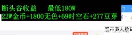 断头谷作为95的循环地图刷起来还是不难的,除了地图房间多点外其余没有什么缺点,收益主要来源于Boss房间掉落的时空石跟豆芽,根据计算满疲劳断头谷收益大概在180万左右,这个收益可以说是比格蓝迪要好得多。