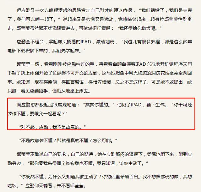 就算他们俩结婚了,邱莹莹的“非处女”,也将永远是应勤心中的一根刺。在《欢乐颂》的原著中,他们婚后两个人要开始正常的夫妻生活了,应勤还是会阴阳怪气地用这件事来指责邱莹莹。邱莹莹并不快乐,她宁愿去面对厨房都不愿和应勤说话。这就像古代罪犯脸上的烙印,变成了应勤永远指责邱莹莹的话柄。
