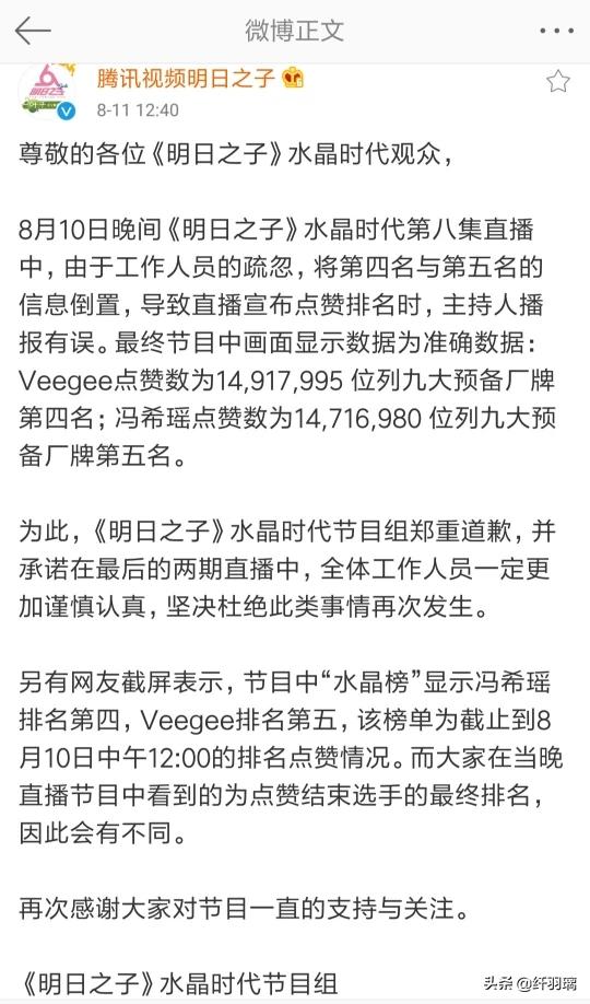 但不怪乎观众有此质疑,因为在投票过程中,冯希瑶无论是水晶榜还是充电榜,都占据了第四的名次,Veegee则一直紧随冯希瑶之后,但最终公布结果时,却是Veegee的票数领先于冯希瑶,不得不让人怀疑。