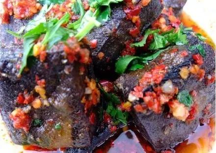 选用上等黄豆做成豆腐,然后把豆腐浸入放有干冬笋、干香菇、浏阳豆豉的卤水中浸透,表面会生出白毛,颜色变灰。初闻臭气扑鼻,用油锅慢慢炸,直到颜色变黑,表面膨胀以后,就可以捞上来,浓香诱人,浇上辣椒、香油,即成芳香松脆、外焦里嫩的臭干子。姊妹团子