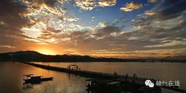 秋冬已至,太阳落得早,傍晚彩霞映照在河面,湖光艳色,你站在桥上看风景,看风景的人在远处看你,你与夜色渐渐融合一起,成了这瑰丽夜景中的一体。这便赣州傍晚最美的风景!
