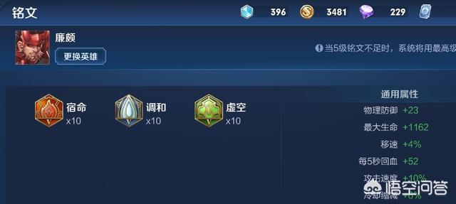 铭文:调和+虚空+宿命。这是一套标准的坦克铭文,可以提高廉颇的血量和回血能力,也有移速和防御等加成。更加可以提高红莲斗篷的伤害能力。