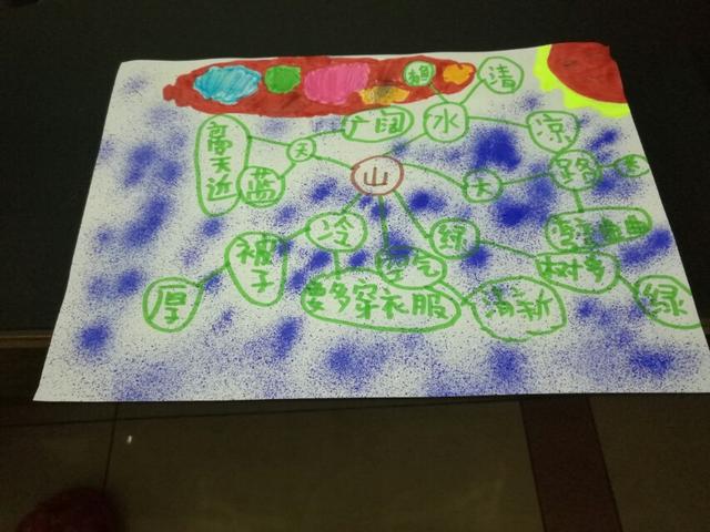 比方上面这张照片,是女儿清明节时写的《山》这篇作文的思维导图,我引导女儿,从山的“颜色、形状、味道(空气)、水、温度(冷)、天”这个方面来描述。女儿的思维就一下子发散开来了。3.写节日
