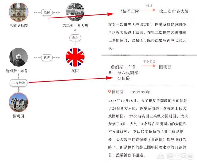 当然还支持输入任意两个事物,查看他们二者的关系,比如输入巴黎圣母院和圆明园,会显示一场是躲过二战却如今发生意外火灾,一场是英法联军纵火,背后的事件点击可查看详情。二者都是全人类瑰宝,让人痛心。
