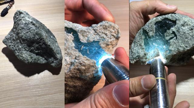 会卡嫩空翡翠原石,皮薄,质地稀松,透光度好!但是毫无价值,市场以公斤料来卖