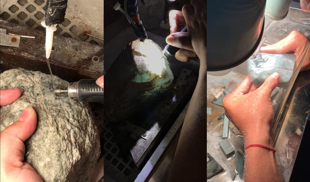 冰种玻璃种的翡翠开窗切割都很费力,切割时间远远超过普通种质的翡翠,图中师傅开窗玻璃种原石用上了两只使力