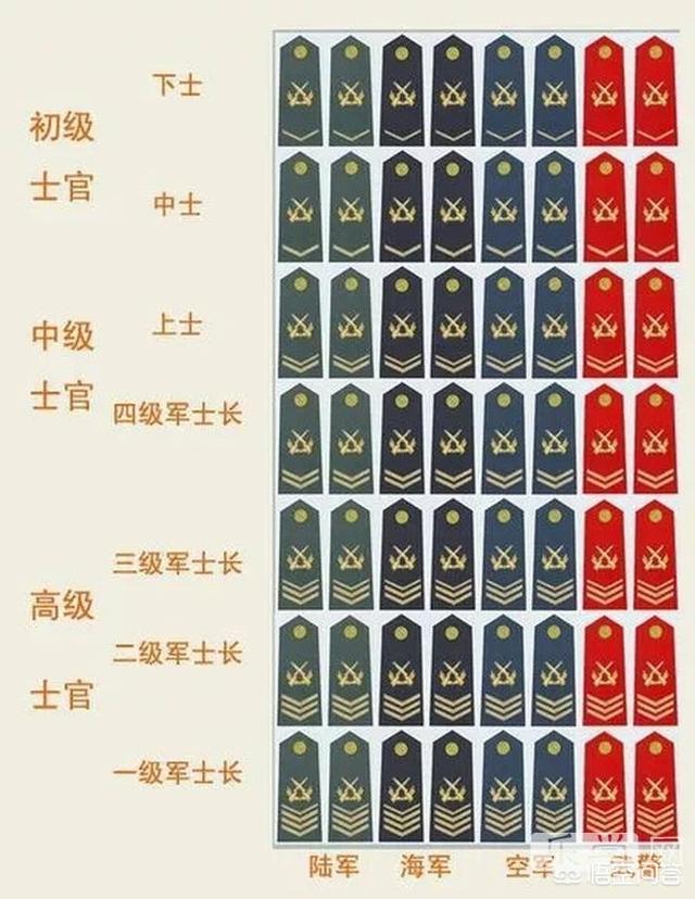士官,即“职业士兵”,高于士兵(普通士兵)。士官一般从服役期满的士兵中选拔,也可从军外直接招募具有专业技能的公民成为士官。士官不属于干部序列,不佩戴资历章。