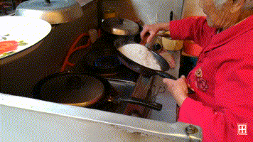 看着饼逐渐变色,奶奶还会很熟练的来个翻面,让饼的两面都能煎到。(来个动图给大家感受一下。)