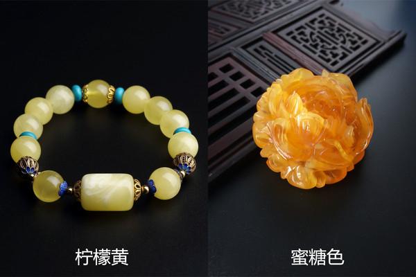 黄色系蜜蜡有:鸡油黄、柠檬黄、蜜糖色蜜蜡。