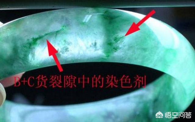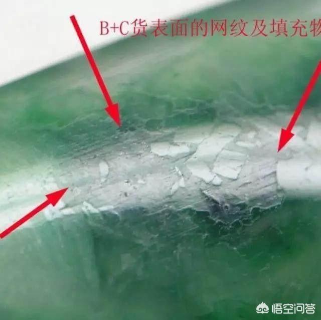 B+C指酸洗后注胶染色的翡翠,分辨B+C与A货翡翠可以从以下方面辨别: