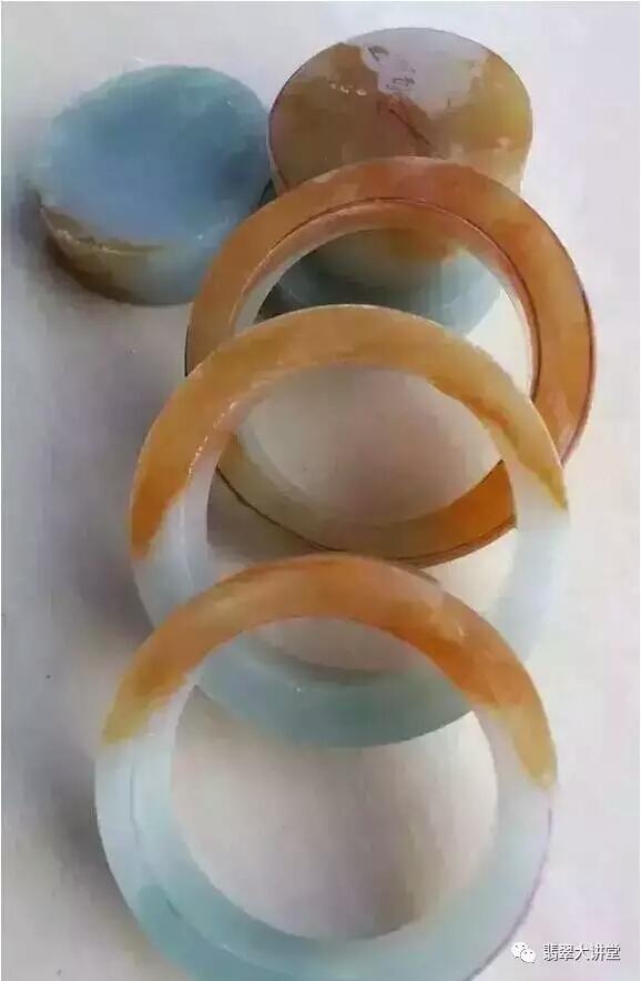 红色和黄色分别是红翡和黄翡。天然红翡极其稀有,原石已经绝迹,所以天然红翡特别是品质高的价格比绿的更贵。相比之下,黄翡比较常见,黄翡种份到了冰种水头又足的话价格也很高,如果能达到鸡油黄就更加珍贵。