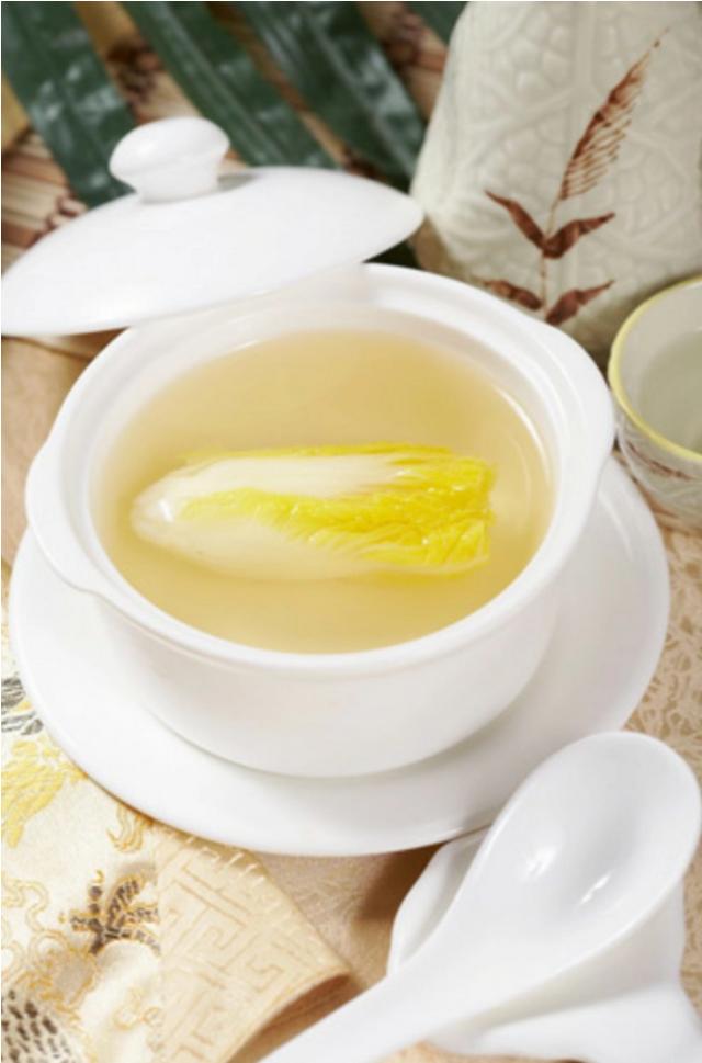 汤清澈见底,却不是开水,用高汤精心熬制而成,白菜选用初冬时未熟透白菜的菜心。