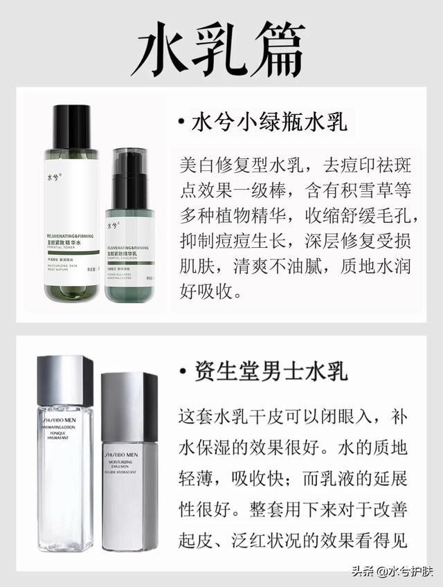 保湿补水产品的作用,就是使水分不要过快流失,让肌肤保持合理的水份量。对于怕繁琐的男生来说,很难做到像精致女生那样,水乳、精华、面霜样样齐全,可以根据自己的护肤需求,选择一套针对肌肤状态调节改善的水乳就可以了。