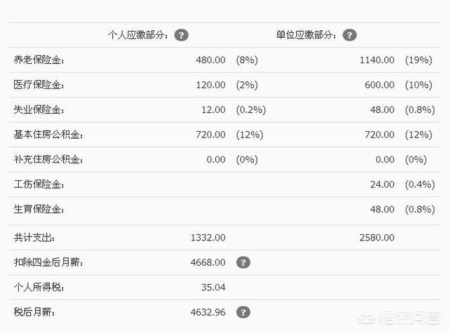 我们以北京市税前6000元为例。在缴纳养老保险金、医疗保险金、失业保险金和住房公积金以及代扣个人所得税之后,实发收入是4632.96元。