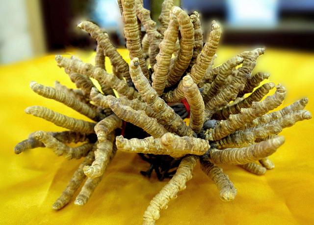 2、在湖南有一种“冬虫草”。为肉座菌科冬虫草属植物亚香捧的全株。干燥品虫体似蚕,淡黄棕色、背面横皱纹、菌座近上端较粗,黑褐色,柄多弯曲,目前还未被认作冬虫夏草入药,暂作假虫草。