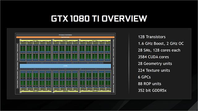 GTX 1080 Ti是NVIDI推出的超强游戏卡,采用与Titan X Pascal一样的GP102核心,3584个CUDA核心,搭配352bit 11Gbps GDDR5X显存,整体规格几乎一致,但是核心频率有所提升,设定在1480MHz,高于Titan X的1431MHz,boost频率可达1582MHz,性能确实高得吓人。