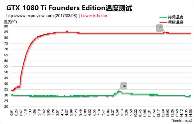 通过查看GTX 1080 Ti 运行游戏温度变化的记录,可以清楚看到显卡温度变化过程。在待机状态的3分钟内迅速攀升至85℃,并且达到一个平衡状态,基本上达到了显卡保护温度。