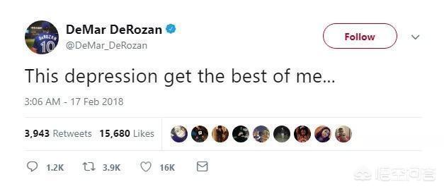 二月份,一条推特让全世界都知道德罗赞被抑郁困扰的消息,现在只希望德罗赞能尽快走出抑郁的阴影吧