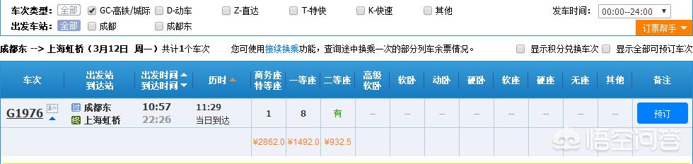 谢谢邀请,这个不难发现,打开12306查询到的车辆信息是只有一趟成都东直达上海虹桥的G1976线,其他的都是动车组,其实动车组和高铁也是差不多,只是速度上稍微慢一点。