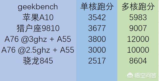每款soc,第一行数据为整数性能,第二行为浮点性能,可以看到,当A76跑到3ghz的,也就是宣传的性能提升35%,不管是整数还是浮点,都微超猎户座9810,浮点性能小胜A10,整数差一点。