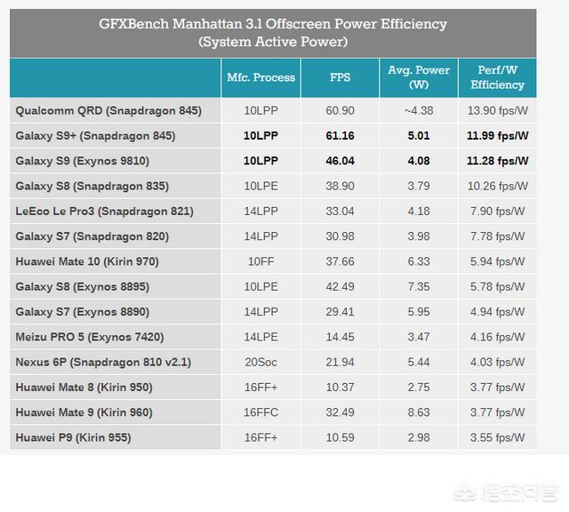 来看看表格中各个处理器的GPU能耗比,表格中最后一列代表了能耗比,数值越高能耗比越优秀,三星给9810堆了18核G72,才追上了高通