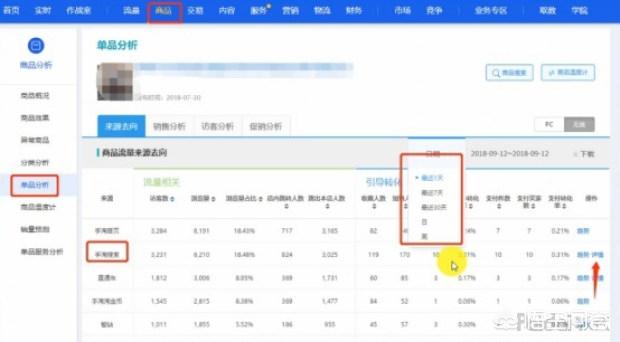 直接点击详情,点开详情之后,就可以看到这样的一个界面,可以看到单品手淘搜索一个非常详细的情况,在流量纵横里面的,把数据分别进行了一个切分。