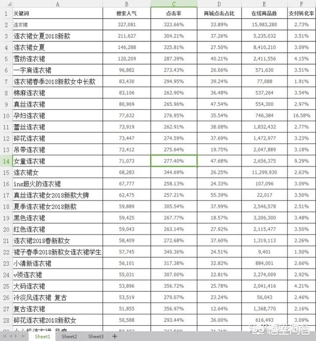 然后同样的方法,我们再用“连衣裙”去搜索筛选。最终得出这张表格,