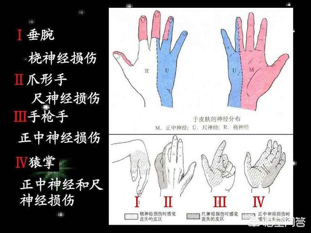 第二种情况:肱骨中下1/3骨折容易导致桡神经损伤。这时候会出现虎口区的麻木,出现手腕不能向背伸,手掌指关节不能背伸。肱骨髁上骨折伸直型容易导致正中神经损伤,会出现中指的麻木。如果导致尺神经损伤,可以出现小指的麻木。