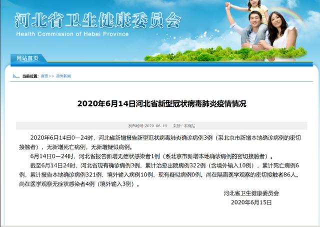 根据河北卫健委网站消息,2020年6月14日0—24时,河北省新增报告新型冠状病毒肺炎确诊病例3例(系北京市6月11日新增本地确诊病例的密切接触者),无新增死亡病例,无新增疑似病例。鉴于北京目前疫情防控的特殊情况,而河北毗邻北京的恶现实,河北各地针对北京的疫情变化,纷纷采取了最新的疫情防控措施。