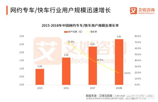 根据iiMedia Research(艾媒咨询)权威发布《2017-2018中国网约专车行业市场研究报告》,自2015年以来网约专车/快车用户规模迅速增长,其中2016年整体用户量呈爆发式增长,增长率高达71.4%,而2016年之后整个行业用户水平增长逐步减缓,呈稳定增长发展态势,到2017年用户规模达到2.36亿人,2018年有望达到2.82亿人。艾媒咨询分析师认为,随着人们生活品质的不断提高,其出行结构不断改变,而传统城市交通已逐渐不能满足用户需求,网约专车作为便捷灵活的出行新选择将会获得更大的发展,市场前景依旧广阔。