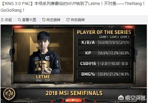 5月18日RNG对阵FNC,干净利落3:0拿下比赛,同时UZI时隔1309天再次杀入世界赛场总决赛,今年UZI完成了两个目标了,拿LPL冠军杀入世界赛决赛,接下来就是MSI冠军了。MSI半决赛最大的功臣属于上单Letme,不,是“The rang”,三场发挥依旧出色,他不在是我们所质疑的短板上单。