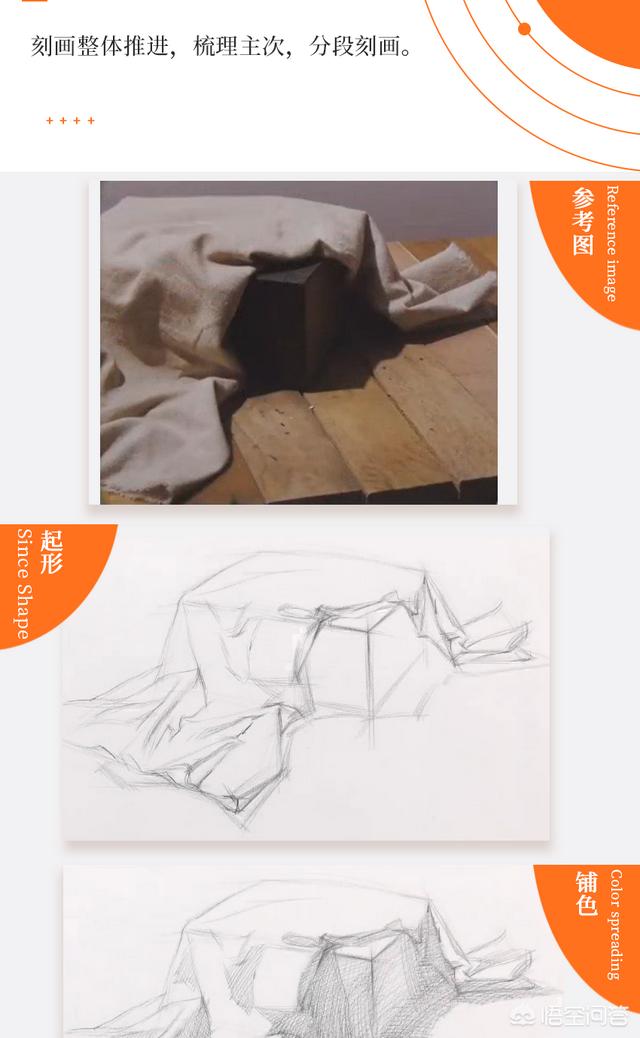 下面的示例是色彩的整体绘画,那么衬布为什么不单独出来?原因在于整体的色调了,把握整体,整个画面才会出彩,而衬布的画法和素描一样: