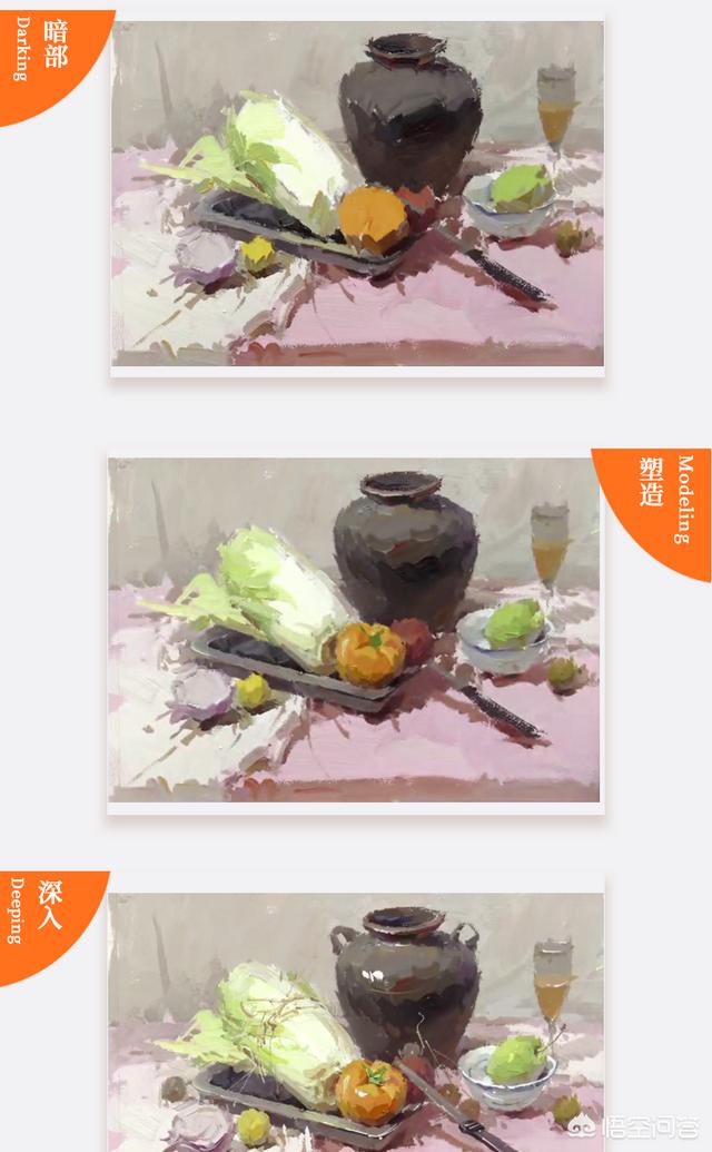先看看素描静物的衬布,你会发现为什么绘画中一定要先学会素描静物,再学色彩静物,而色彩静物要从单个静物开始慢慢熟悉。原因就是打好基础,简单来说重要的是先找对形状,逐步完善整体再进入刻画,最后刻画的时候要注意黑白灰的关系,因为问题不是针对素描就简单略过了。主要来看下色彩静物。