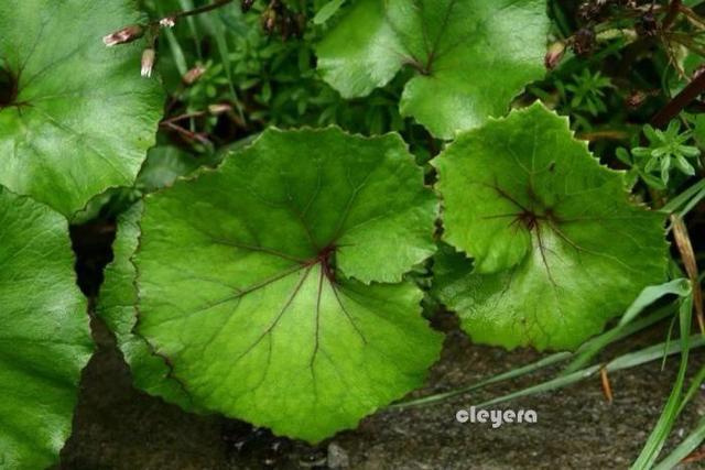 基生叶莲座状,肾形,长9-13厘米,宽11-22厘米,先端圆,全缘或有小齿或掌状浅裂,基部弯缺宽,长为叶片的1/3,两面幼时被灰白色柔毛,后无毛;叶柄长15-25厘米,幼时密被淡黄色柔毛,后多脱落,基部短鞘,抱茎,鞘内被密毛;茎生叶1-3,苞叶状,长圆形或线状披针形,长1-2厘米。