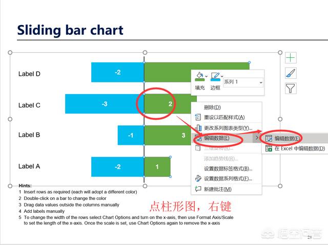 (1)柱状图,如下图的左右对比图,在柱形图上右键,“编辑数据”即可。
