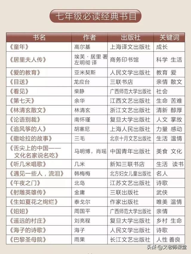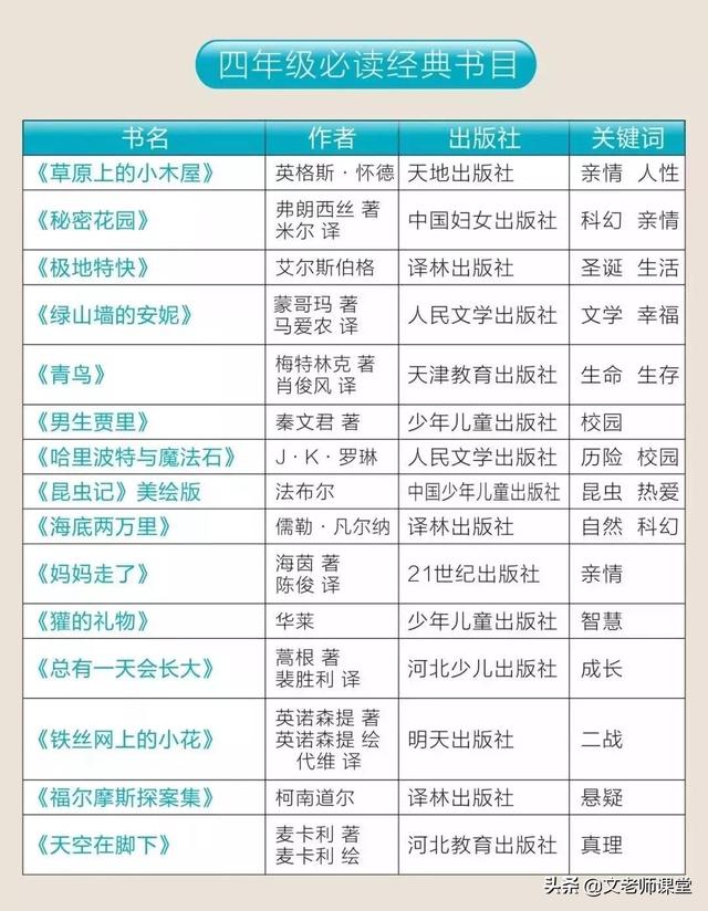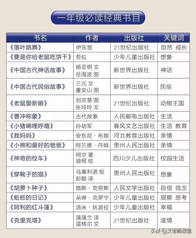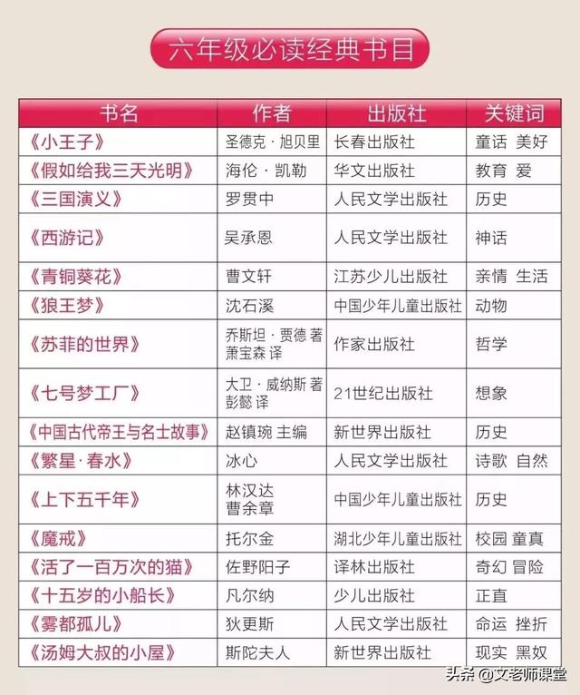 给你拍一张我的孩子学校所发的书目的照片吧,就不打字了,从小学一年级到六年级,一览表的形式,一目了然。