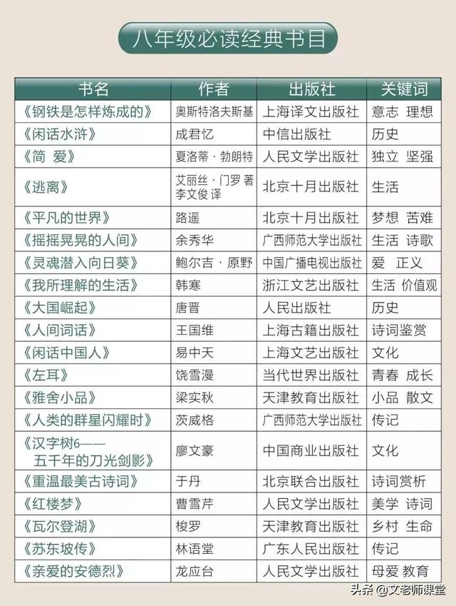 《故事新编》《女神》《骆驼祥子》《子夜》《围城》《家》《屈原》《毛泽东诗词选》《雷雨》《四世同堂》《红岩》《谁是最可爱的人》《青春之歌》《青春万岁》《寄小读者》《傅雷家书》《平凡的世界》
