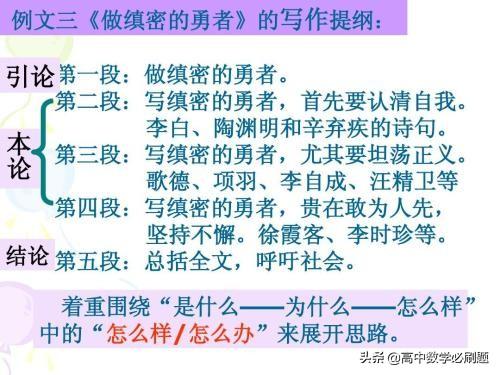 议论文中间的论证部分一定有条不紊,思维严密。最好能是并列式或者是层进式的结构来确立几个分论点。这样的结构让作文既整齐又有气势,而且能让阅卷老师非常清晰地了解你的行文思路。