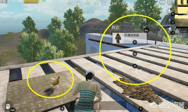 走到上面我们就可以看到老母鸡和吉利服拉!!这个母鸡是打不死的,他会一直站在那里,然后吉利服是沙漠新出的吉利服,只能在沙漠地图上刷新,这个同时放了两个彩蛋,也是让玩家对这个游戏充满了信心,反正我是很喜欢啦哈哈哈