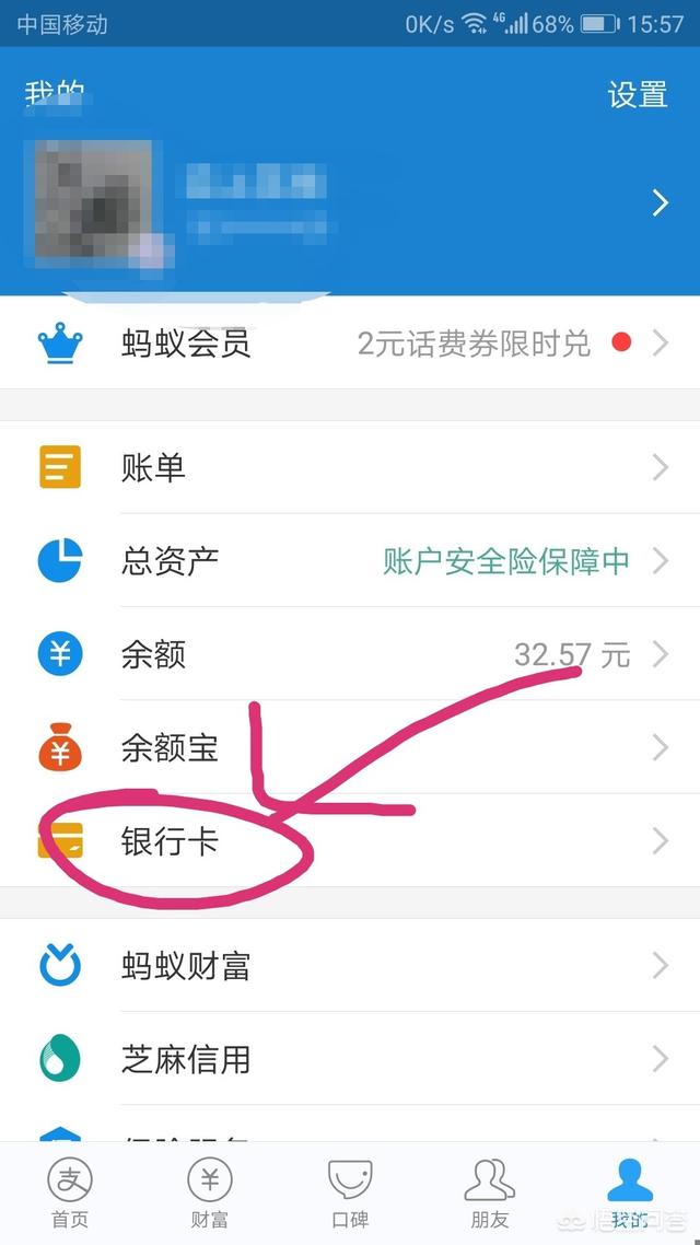 在上图我们可以看到"银行卡"这一选项(图中红色圈⭕标识),然后点击"银行卡"按钮选项,进入界面显示如下图(首先你必须绑定银行卡),