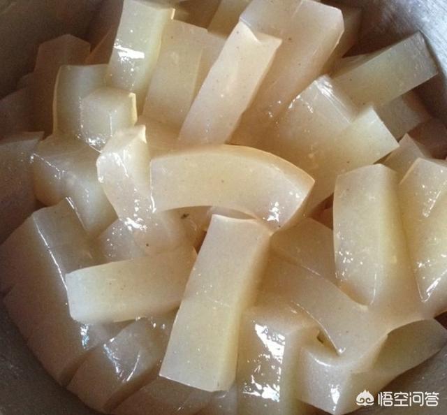 魔芋的做法是用植物的根块磨成浆,加热煮开加入生石灰水,冷却后凝结成块状物,切开就可以食用了。