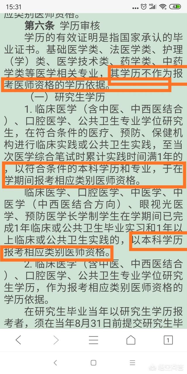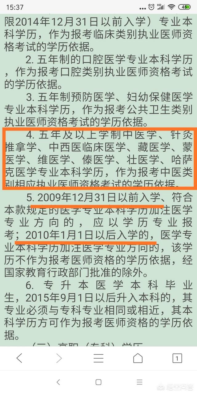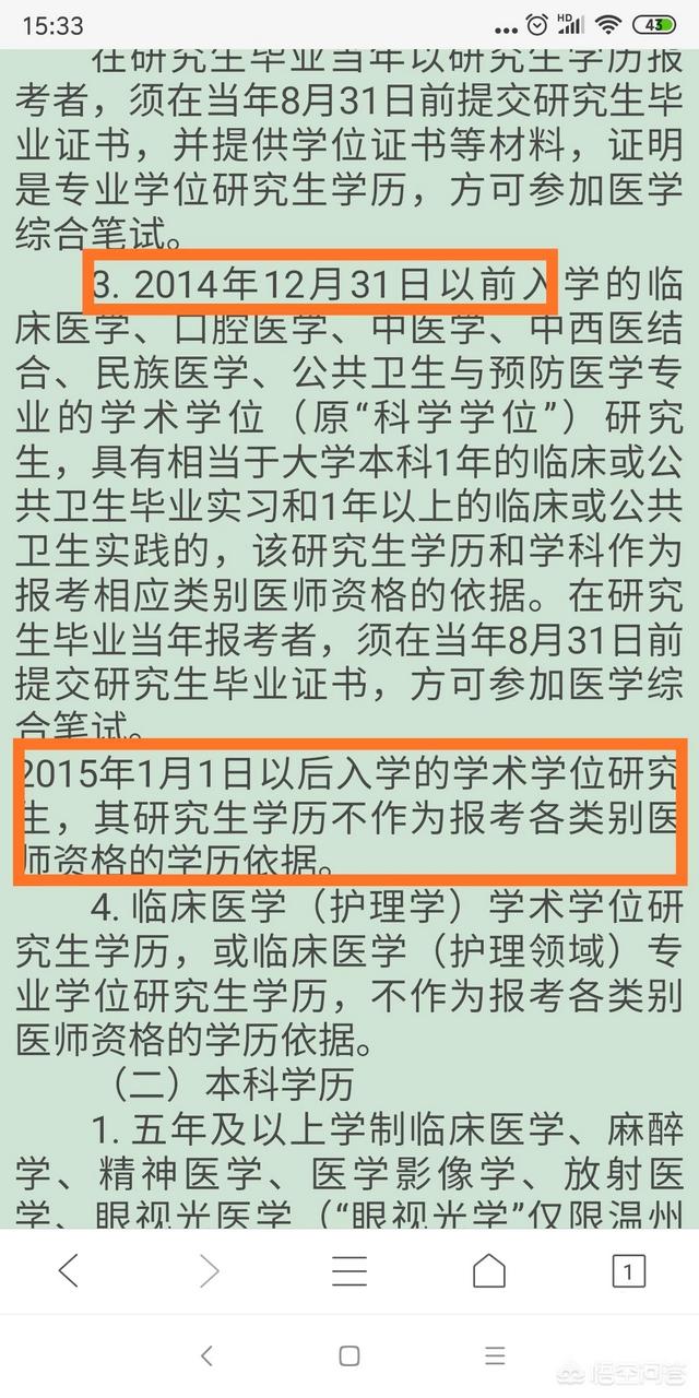 3、重点来了:“2015年1月1日以后入学的学术学位研究生,其研究生学历不作为报考各类别医师资格的学历依据”。也就是说如果你是学硕,必须用你的本科学历报考,那就只能报考中西医结合执业医师。