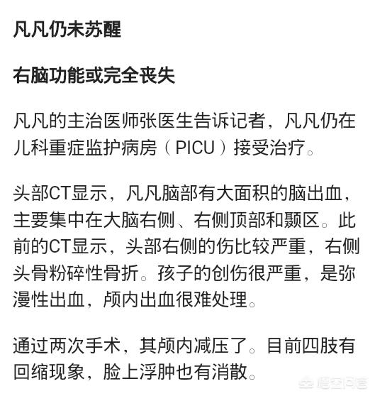 目前,孩子仍处在昏迷的状态。颅压还是偏高,瞳孔两侧不等大,反应还是很不好,暂时还没有脱离生命危险。 孩子的头部CT显示,脑部有大面积的脑出血,头部右侧的伤比较严重,右侧头骨粉碎性骨折。
