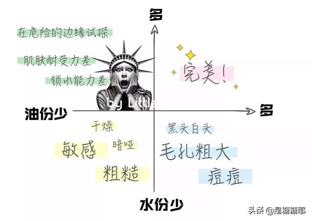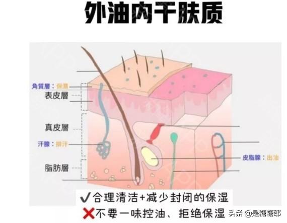 这里补充一个重要的概念,干皮和油皮的区分在于皮脂分泌的多寡。皮肤含水量,也就是干燥程度并不是决定皮肤类型的因素,它只是描述了一种皮肤状态,而且皮肤的含水量随时都有可能受到影响,进而发生变化,任何皮肤都有缺水干燥的时候。“外油内干”肌只是表现出了干燥缺水的一种皮肤状态,但本质上还是油性肤质,护肤也还是以油皮护肤方案为主