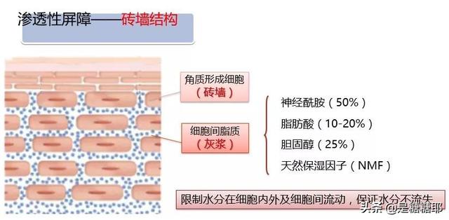 20世纪70年代Peter Elias教授将角质层比喻为“砖墙结构”,角质细胞为“砖块”,间接堆砌于连续的、有特定脂质和蛋白组成的基质“灰浆”中,维持和保证它们功能正常,才能确保皮肤的完整性、正常的水合作用以及维持皮肤的正常屏障功能,其一方面保护体内皮肤免受外界环境中有害因素的侵袭和刺激,另一方面防止组织内的各种营养物质、水份和电解质丧失