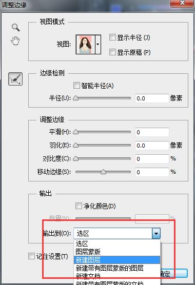 在Photoshop中通过“调整边缘”命令可以对已建的选区进行半径、对比度、平滑、羽化以及扩展与收缩的综合调整,在图像中创建选区后,执行菜单中“选择/调整边缘”命令,即可打开如图所示的对话框。