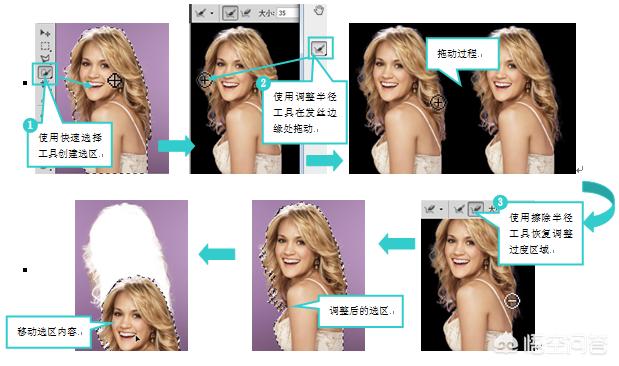 通过调整半径工具为发丝区域创建选区对话框中的该工具是用来手动扩展选区范围,按Alt键变为收缩选区范围。该选项通常用在对图像的精确选取,也就是抠取复杂图像,抠图过程如图所示。