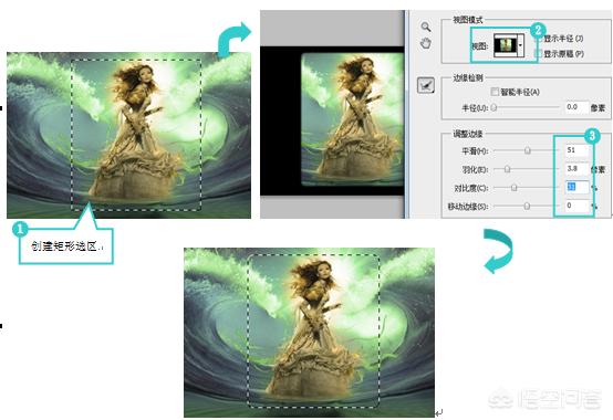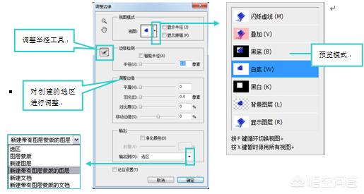 找一张自己喜欢的图片创建选区后,通过“调整边缘”命令可以对选区进行相应的调整,调整过程如图所示。
