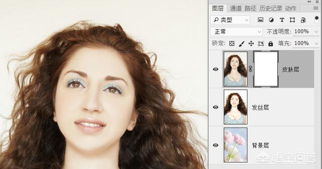 6.到这里准备工作就做好了,为了那些不太熟悉PS的朋友在后面操作的时候不乱套,建议你可以将三个图层的名称修改一下,直接在图层名称位置双击鼠标就可修改。从上到下依次修改为:皮肤层、发丝层、背景层。